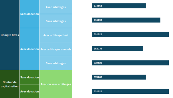 Si les arbitrages sont fréquents : le contrat de capitalisation prend un avantage décisif. L'absence de taxation lors des mouvements permet de réinvestir l'intégralité des gains, créant un écart de performance significatif sur le long terme. Le contrat justifie bien son nom de capitalisation qui conduit à un différé d’imposition.