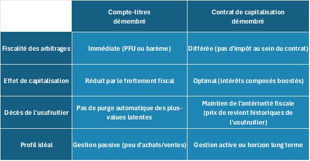 Si les arbitrages sont rares ou inexistants : le compte-titres démembré peut s’avérer très performant, car il n’y a pas d’imposition tant qu’il n’y a pas de cession de la part de l’usufruitier. Toutefois, la taxation latente lors d’une cession ultérieure par le donataire doit être anticipée.